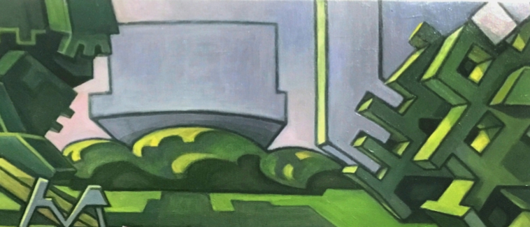 Sky blocks interlocking with trees.